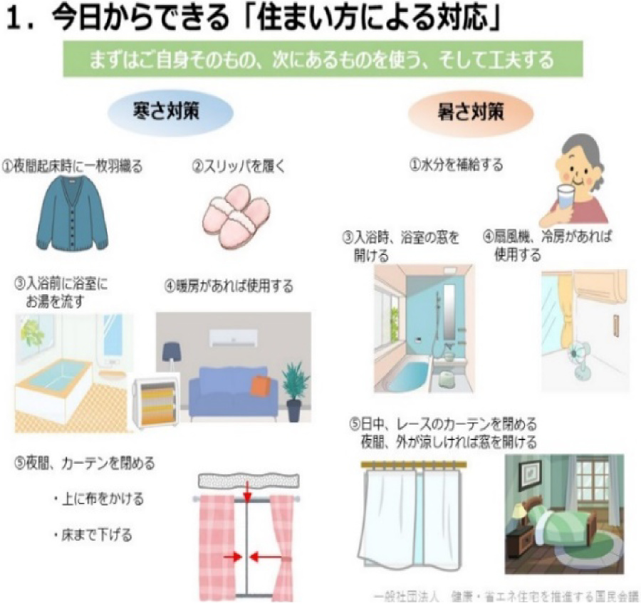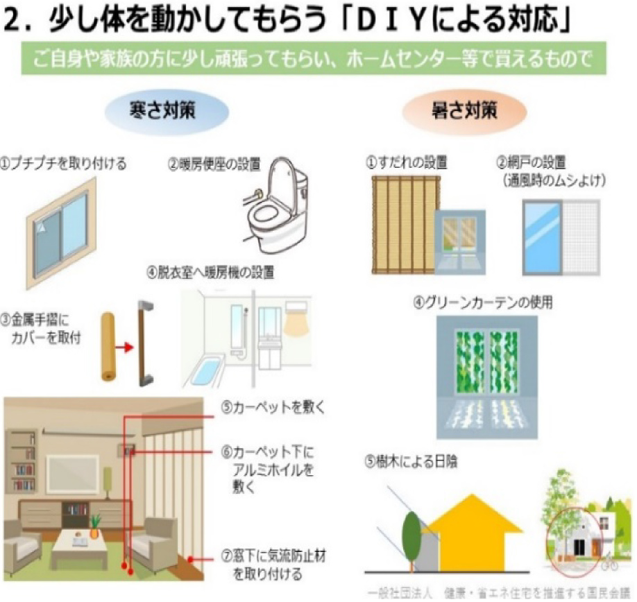 私たちが普段の生活の中で工夫することで寒さや暑さから身体を守ることができる工夫は意外とたくさんあります。また、ちょっとしたDIYレベルの対策で改善されることも多くあります。