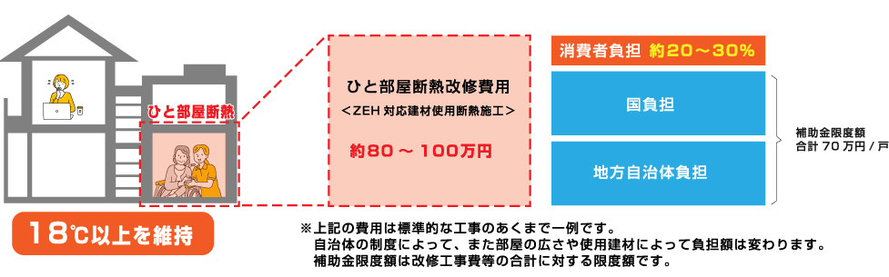 健康寿命を延ばすために必要なのは18℃以上を維持すること。そのために必要なひと部屋断熱リフォームを実現する改修コストは約80~100万円※工事内容により金額は変わります。補助の交付対象費用の8割を限度として国や自治体から支援があります。