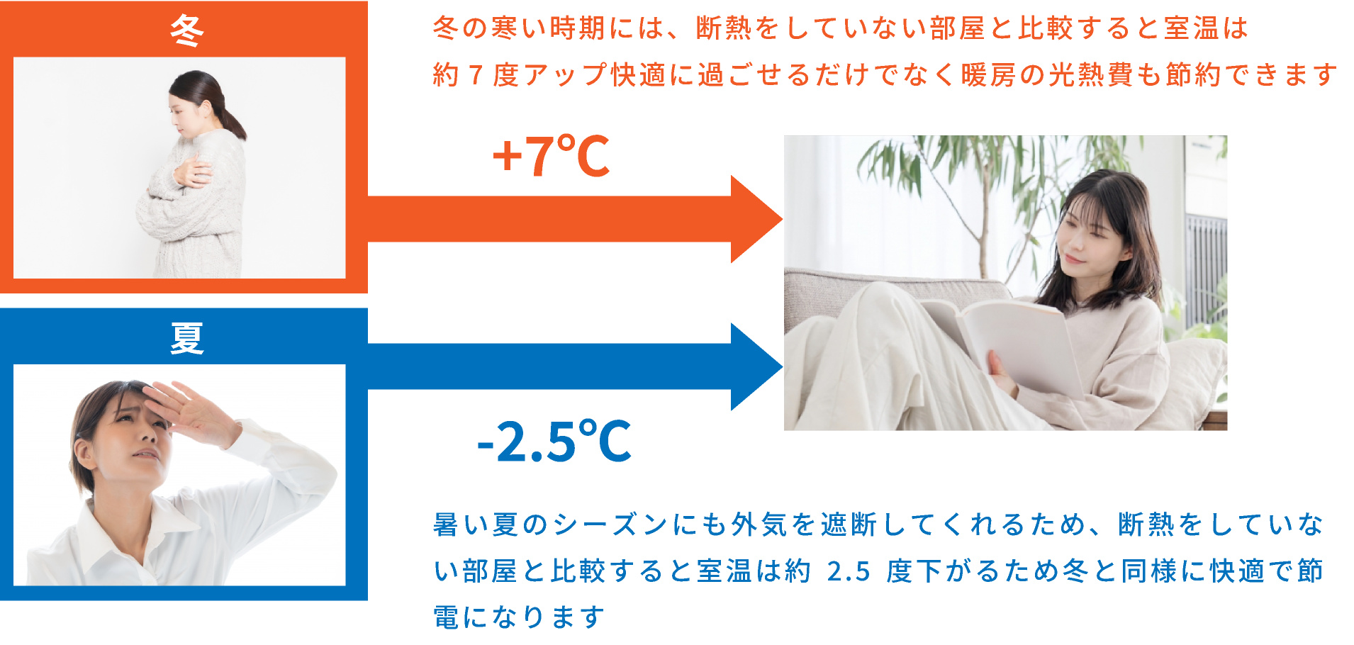 家の主となるひと部屋を断熱リフォームすることで、室温が保たれるため冬のヒートショックや夏の熱中症などの健康リスクを回避できます。また、外気の影響を受けにくいため冷暖房の使用量も抑えられるため、省エネ・節約にも貢献します。