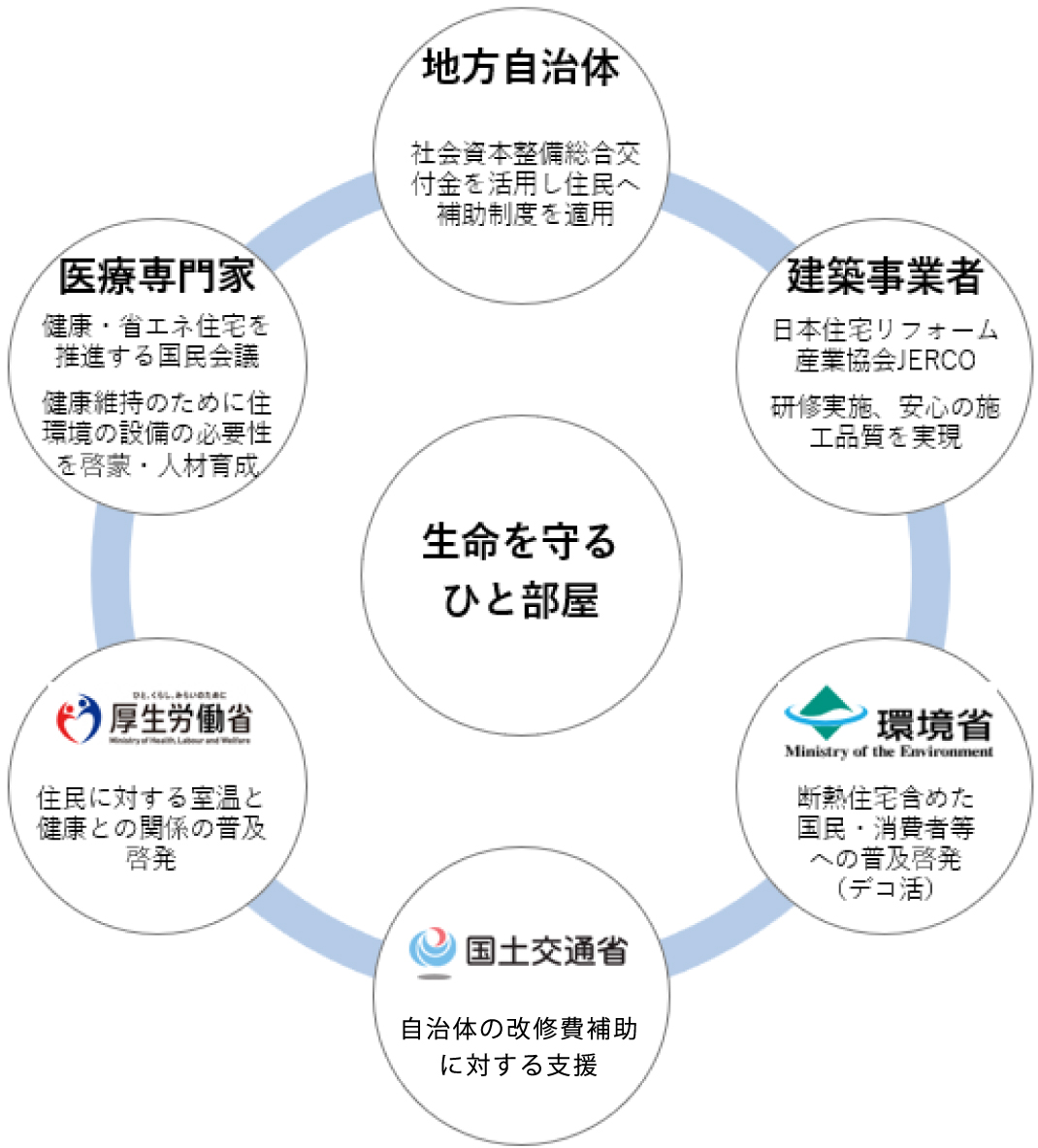 健康増進法に基づく、国民健康づくり運動「健康日本21(第三次)」では、国民の健康の増進の推進に関する重要事項として、関係する行政分野との連携を掲げ、建築・住宅等の分野における取組と積極的に連携することが明記された。また自然に健康になれる環境づくりのために、室温が血圧・睡眠などの健康状態に影響を与えることなど、エビデンスの収集や普及啓発等エビデンスに基づき必要な取り組みを進める。